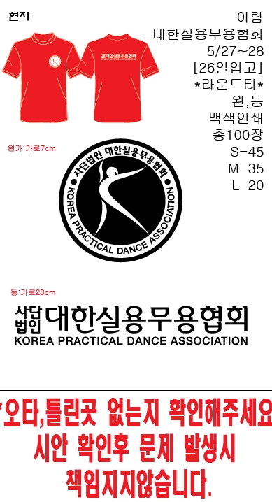 대한실용무용협회에서 단체 라운드 티셔츠를 제작했습니다. 강렬한 레드 컬러의 원단에 백색 인쇄를 적용하여 무용 협회의 에너지와 활력을 잘 담아냈습니다. 앞면 왼쪽 가슴에는 협회 로고가 가로 7cm 크기로 인쇄되었고, 뒷면에는 ‘대한실용무용협회’ 문구와 영문명이 가로 28cm 크기로 크게 들어가 단체의 위상을 강조했습니다. 총 100장이 제작되었으며 사이즈 구성은 S – 45장, M – 35장, L – 20장으로 이루어졌습니다. 무대 위에서 단체의 통일감을 표현하고, 실용무용협회의 정체성을 확실히 드러내는 유니폼으로 완성되었습니다. 이번 단체복은 무용수들의 열정과 협회의 전문성을 동시에 담아낸 의미 있는 제작입니다.
