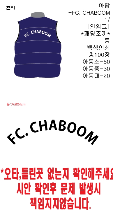 FC CHABOOM 팀을 위한 맞춤 패딩 조끼가 제작되었습니다.겨울철 야외 활동이나 훈련 시에도 따뜻하게 착용할 수 있도록보온성과 활동성을 고려한 디자인이 적용되었습니다.등 부분에는 큼직하게 ‘FC. CHABOOM’ 레터링이아치 형태로 흰색 인쇄되어, 멀리서도 단번에 팀을 알아볼 수 있습니다.군더더기 없는 심플한 디자인이지만,강렬한 존재감을 남기는 포인트가 되어 줍니다. 제작 수량 아동 소 : 50벌 아동 중 : 30벌 아동 대 : 20벌 총 100벌이 준비되어, 어린 선수들이사이즈에 맞춰 편안하게 착용할 수 있습니다.특히 이번 조끼는 활동이 많은 축구팀 특성을 반영하여움직임을 방해하지 않으면서도 보온 효과가 뛰어난 소재로 제작되었습니다.등 부분 로고 역시 선명하고 깔끔하게 표현되어단체 착용 시 팀의 통일성과 프로페셔널한 이미지를 강조합니다.